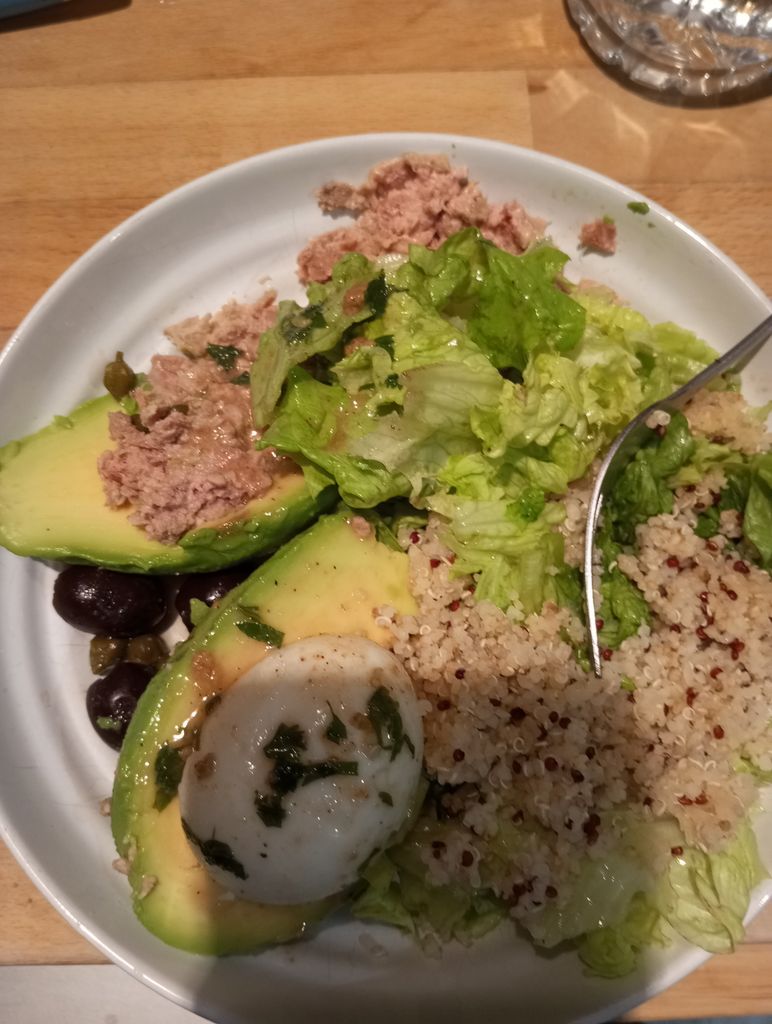 Boulgour + quinoa + thon + olives et câpres + oeuf dur + avocat. Et deux craquottes.
