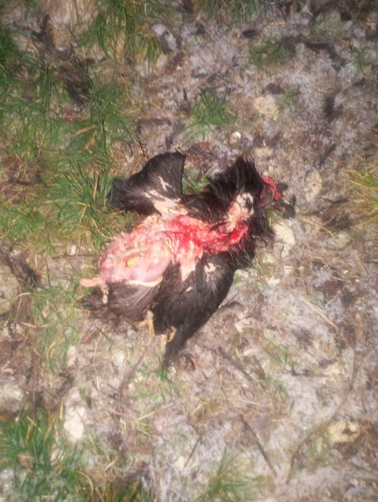 Je présume que c'est un renard qui a fait le coup. Je ne vois aucun trou nul part donc il a dû grimper et bouffer la poule dans le poulailler.