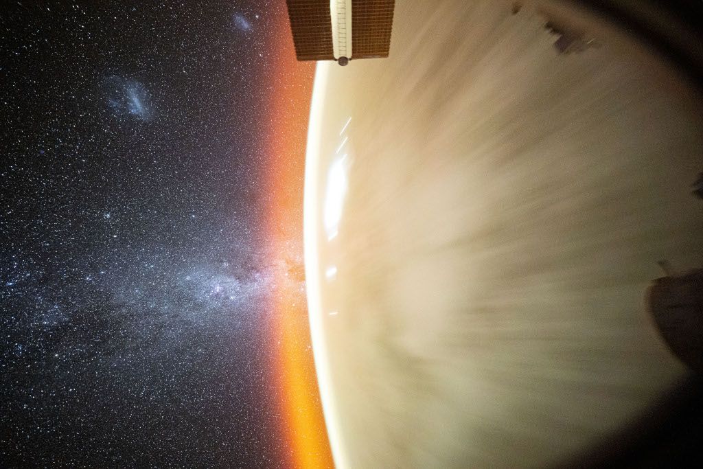 Le plan de notre galaxie de la voie lactée s'étend au-delà du membre de la planète Terre dans cette exposition spatiale capturée par l'astronaute Don Pettit. Son appareil photo, avec des réglages de faible luminosité et de longue durée, a été signalé par la fenêtre d'un vaisseau spatial de l'équipage de dragon amorcé avec la Station spatiale internationale le 29 janvier. L'avant-poste orbital était à une altitude d'environ 400 kilomètres au-dessus de l'océan Pacifique à l'époque. Le mouvement brouille la terre en dessous, tandis que la vue magnifique de l'orbite terrestre basse comprend les galaxies satellites proéminentes de la Voie lactée, connue sous le nom de grands et petits nuages magellaniques, près de la partie supérieure à gauche dans le cadre. Les fans de Southern Skies peuvent également repérer la croix du sud. Les quatre étoiles les plus brillantes du célèbre nœud de constellation du Sud sont près du centre d'images, juste au-delà du bord de l'horizon brillant et brillaient à travers une lueur atmosphérique teintée orange de la Terre.
