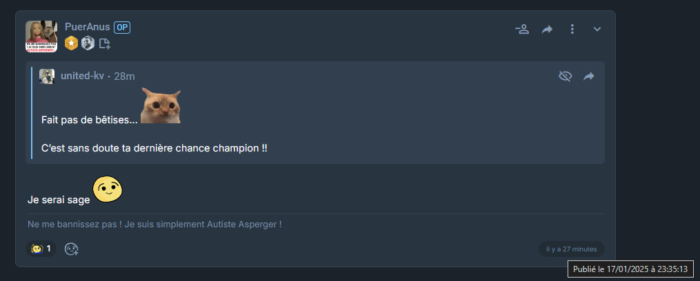 Puis il est deban pour son exploit d'avoir détruit le discord davn pas pour les autres choses car si on part de ce point de vue fallait le ban direct et pas attendre car tout ses dérapages date de jvc