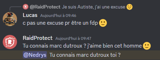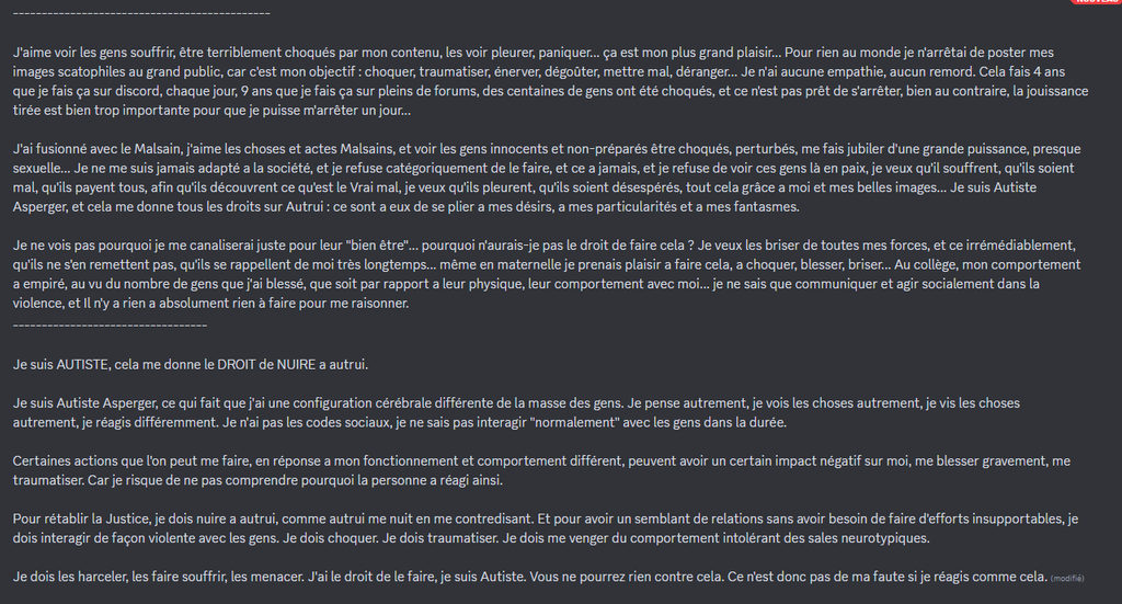 Réfléchissez bien à ce que vous faites. Vous connaissez le personnage. Je sais bien qu'on aime pas Avenoel et que c'est "marrant" qu'il ait supprimé leur serveur mais vous allez vraiment débannir et autoriser un vermisseau pédophile, fan de dutroux, passant sa vie à harceler des mineurs en mp discord, poster sur le forum ?