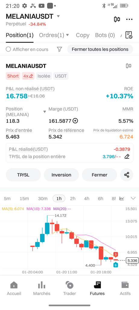 si sa crypto de Mélania Trump monte a 6.724. je suis liquidé. Perte de 160 $. Si ça chute je gagne 200 dollars.je croise les doigts.