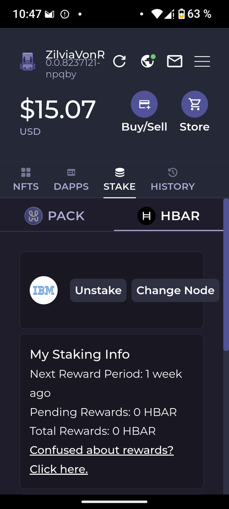 Vu qu' on s' installe sur quand même long avec, on va le stacker (détenir) sur son wallet et app officielle, Hashpack, et sur le noeud de IBM en échange d' un intérêt annuel dessus (2,5% révisable) payable apparemment chaque semaine et restacké dessus
