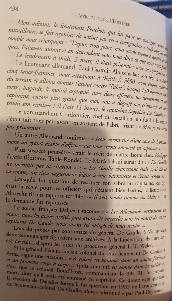 De Gaulle est blessé au point d'être laissé pour mort à Douaumont et d'avoir une citation à titre posthume mais bien sur il aurait du continuer à se battre