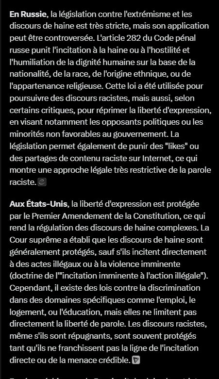 Les USA c'est plus compliqué, déjà ils permettent la parole libre sur le racisme et même sur le révisionnisme ce qui n'est pas le cas en Russie :