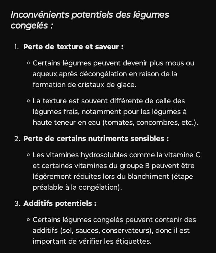Sans parler que le congelé rend pas mal d'eau, qu'il fait perdre la saveur et rend la texture caoutchouteuse sur certains légumes.