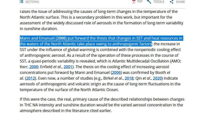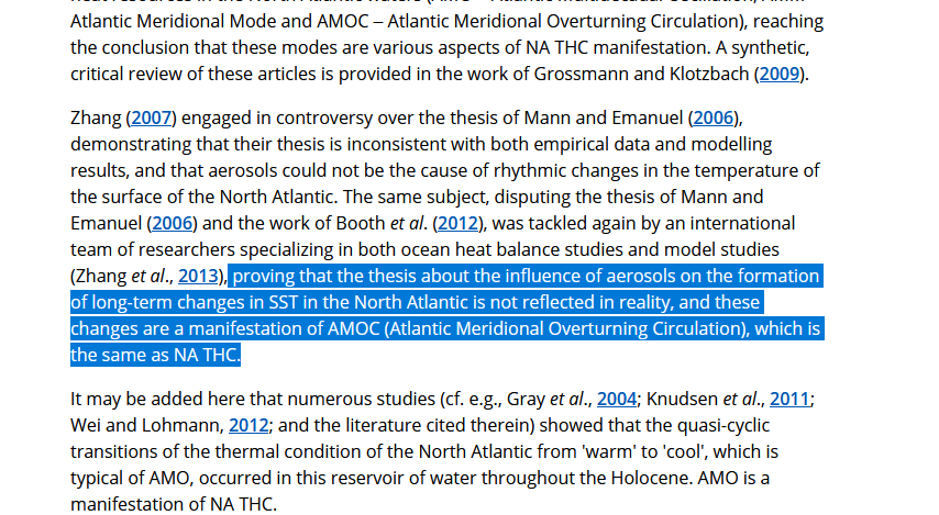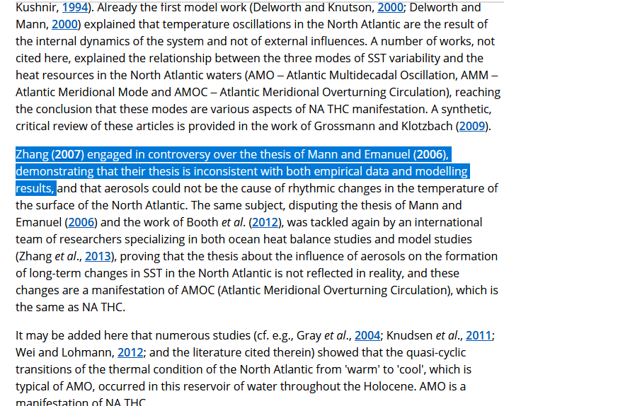 Zhang (2007) engaged in controversy over the thesis of Mann and Emanuel (2006), demonstrating that their thesis is inconsistent with both empirical data and modelling results, and that aerosols could not be the cause of rhythmic changes in the temperature of the surface of the North Atlantic.