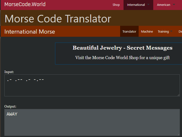 Le mot "AWAY" en code morse est : .- -- .-- -.--
