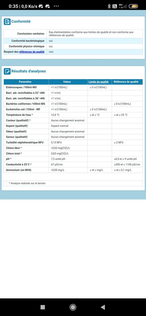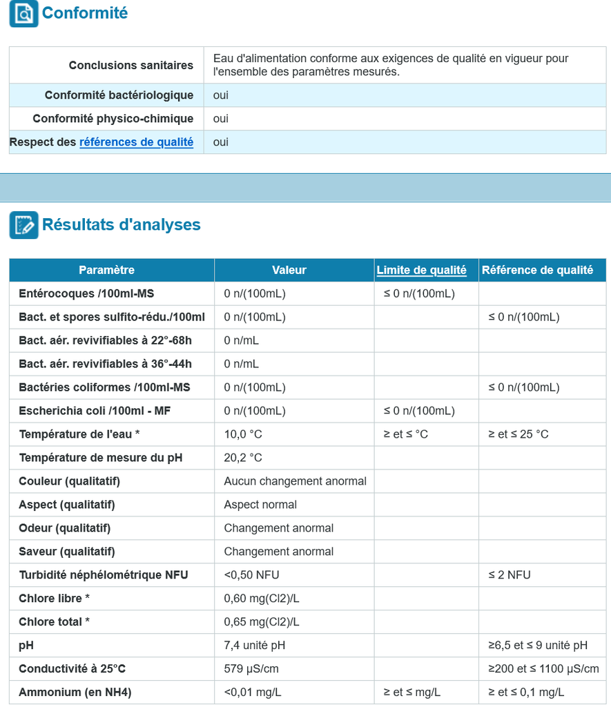 Si vous avez des doutes je vous met les normes de qualité pour l'eau et je reste disponible pour vos questions