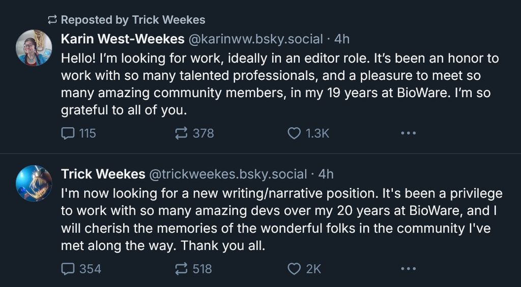 Bizarrement, immédiatement après les employés problématiques ont commencé à supplier sur le réseau pédophie "Blue Sky" pour avoir un travail chez d'autres compagnies, des employés qui travaillent chez Bioware depuis des années comme Patrick "Trick" Weekes et Karin West-Weekes