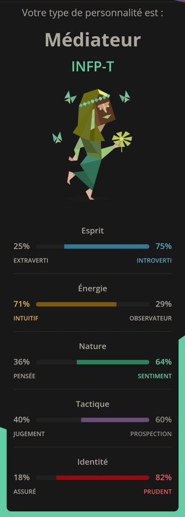 La plupart des gens disent n'importe quoi, y compris à leur propre test fait sur le premier lien google disponible. J'en pense que non et ENFP, condition nécessaire pour devenir schyzo en cas de souci médical