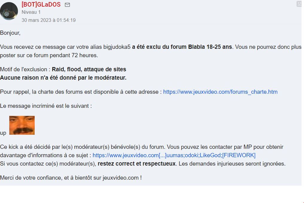 Ça m'étonne pas il me fait le coup aussi en fait, dès que je deviens un peu trop actif sur le 18-25 il me kick à vue un post sans raison pour me dégager 3 jours, ce mec est un gros rageux et en plus dans sa modération il y avait des pédophiles ( cf love-n-piece ) et ose se prendre pour je ne sais pas quoi