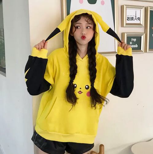 Potites converses étanches jaunes et un hoodie Pikachu avec des oreilles attachées à la capuche