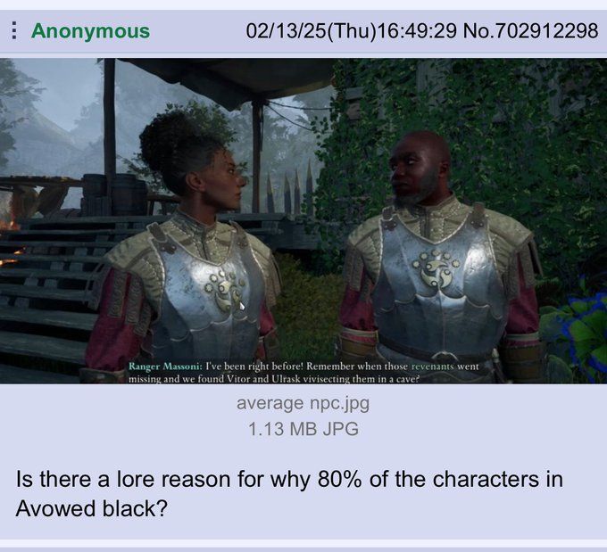 Les femmes dans la légion, les noirs partout, les gentils disciples qui viennent rééduquer les raiders pour les intégrer à la société, House qui veut instaurer une démocratie, etc... Effectivement, mieux vaut éviter que le jeu ne devienne ultra woke.