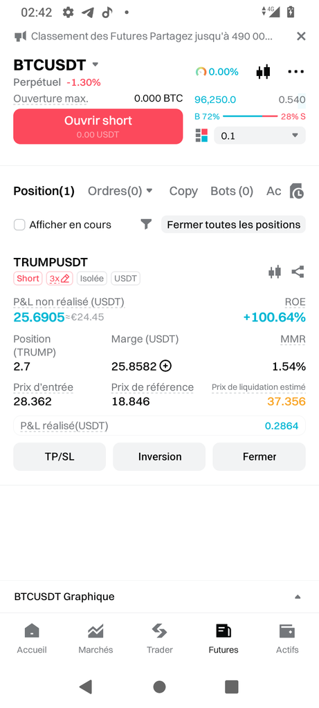 Mon trade levier X3 sur le shitcoin 'Trump' toujours en gain , je crois trade ouvert depuis un mois environ. Toujours pas liquider. Bref , plus il baisse et plus je gagne du fric. J'aurais dû miser plus gros mise. Mais bon tanpis.. Pour moi , c'était donné ce trade , pas besoin de bac +7 en finance etc.., juste voilà , Trump a balancé sa crypto avant élection ( il a gagné 25 milliards bénéf ) . La il est au pouvoir, il peut plus tweet sa crypto sinon les médias l'enculent et lui donné mauvaise image de président etc..etc..= sa crypto est obligé de chuter .... Putin j'aurai du parier 1000 dollars. Fait chier.