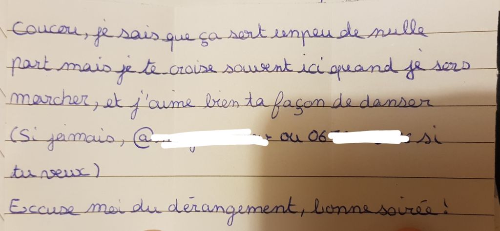 J'avais pensé à juste lui donner un papier si j'arrive pas à lui adresser la parole (parce que je vais pas attendre 1 mois non plus si j'y arrive pas), vous pensez que ça va ? (Ça fait creep / je modifie ?)