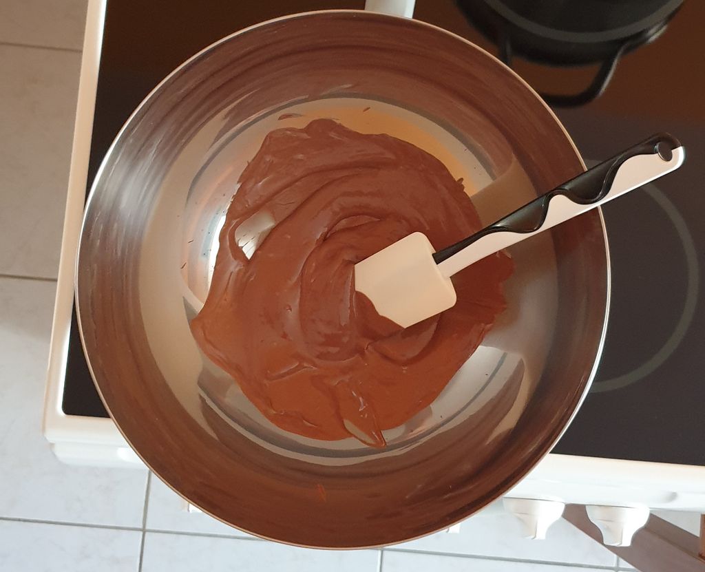 Tu mélange délicatement les pétales en les enrobant de chocolat.
