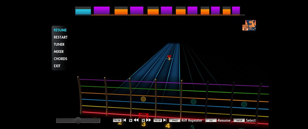 Un exemple bête sur cette image, les passages/riffs en violet sont à 100% donc avec toutes les notes d'afficher.