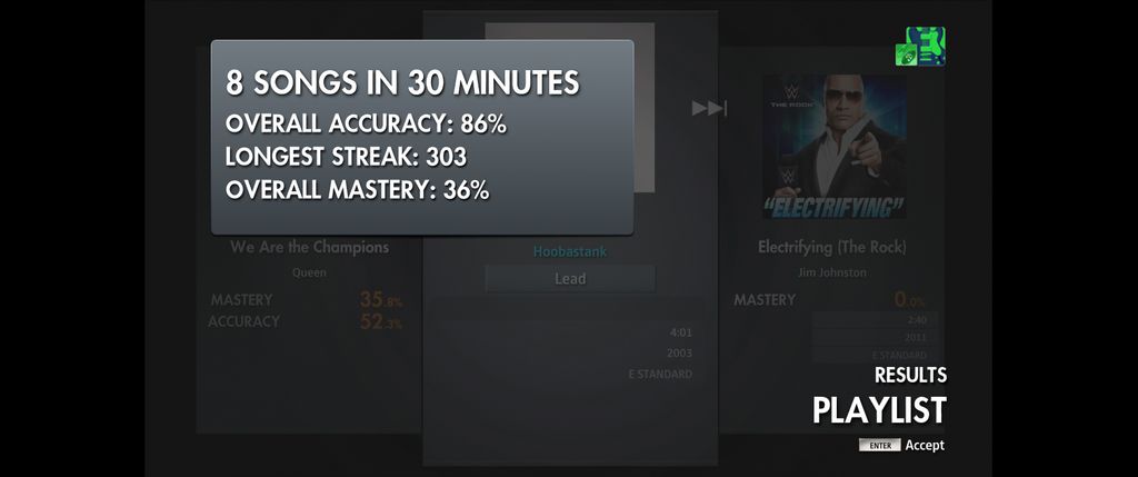 Par exemple sur du A7X, sur "Hail to the King", le jeu m'as mis directe mis des passages/riffs à 50-70% et parfois à 100% sur les riffs les simple.