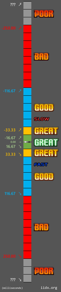 Sinon le timing en réalité est pas aussi serrer, si tu regarde cette image pour IIDX tu te rend compte que le vrai timing pour un Pgreat c'est plus 33ms