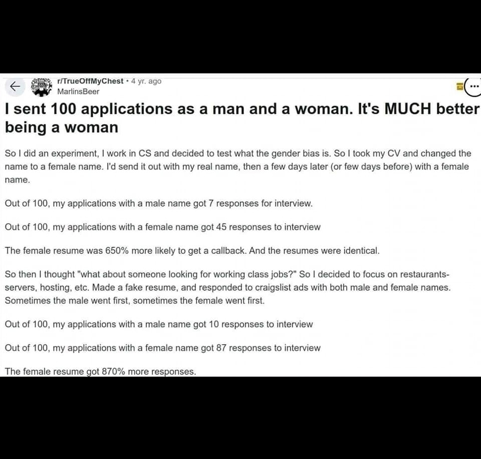 Un type de reddit a fait une expérience perso et il avait 650% plus de chances d'être rappelé par l'employeur en tant que femme, à compétences égales. Et 870% dans les métiers prolos.