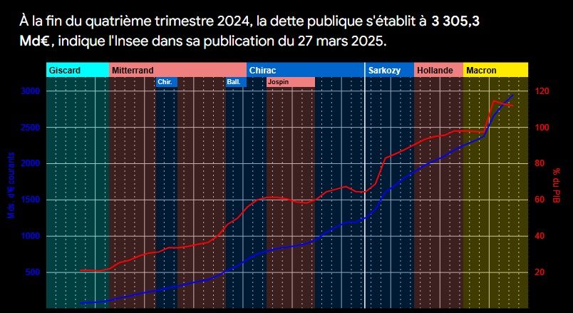 À la fin du quatrième trimestre 2024, la dette publique s'établit à 3 305,3 Md€, indique l'Insee dans sa publication du 27 mars 2025.