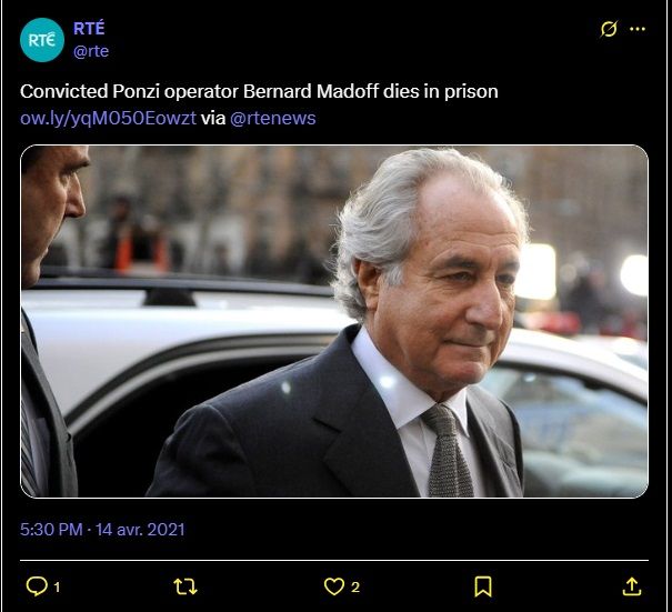 Convicted Ponzi operator Bernard Madoff dies in prison http://ow.ly/yqM050Eowzt via @rtenews