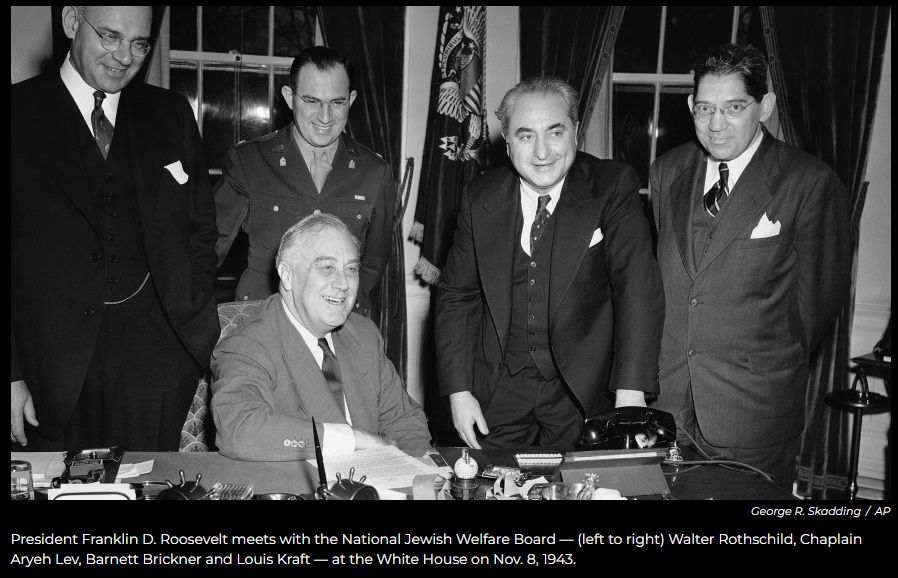 Le président Franklin D. Roosevelt rencontre le National Jewish Welfare Board — (de gauche à droite) Walter Rothschild, l'aumônier Aryeh Lev, Barnett Brickner et Louis Kraft — à la Maison Blanche le 8 novembre 1943.