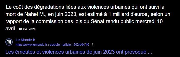 Le coût des dégradations liées aux violences urbaines qui ont suivi la mort du délinquant Nahel M., un maghrébin mettant en danger des vies sur la route et qui a été neutralisé par un policier qui a fait son travail, en juin 2023, est estimé à 1 milliard d'euros, selon un rapport de la commission des lois du Sénat rendu public mercredi 10 avril.10 avr. 2024 Des non occidentaux ont saccagé dans plusieurs villes, ont fait des délits et crimes, montrant les trafiquants de drogue, dont des pays producteurs de drogue comme le Maroc, Afghanistan, Syrie, les diasporas amenant des trafics.