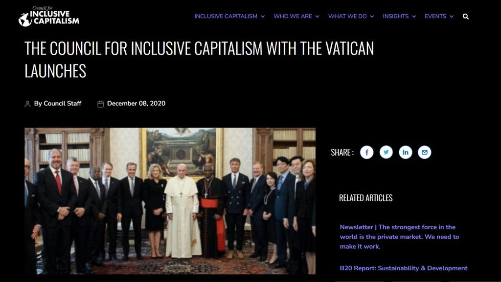 Le Conseil est dirigé par un groupe de dirigeants mondiaux, les « Gardiens du capitalisme inclusif », qui se réunissent chaque année avec le pape François et le cardinal Turkson. Ces dirigeants représentent plus de 10 500 milliards de dollars d'actifs sous gestion, des entreprises dont la capitalisation boursière dépasse 2 100 milliards de dollars dans plus de 163 pays. Les diasporas juives en profitent pour corrompre politiques et faire leur agenda israélien face aux impérialismes islamiques dont ils refilent les migrants contre l'Occident, une politique cancéreuse et mondialiste parasitaire.
