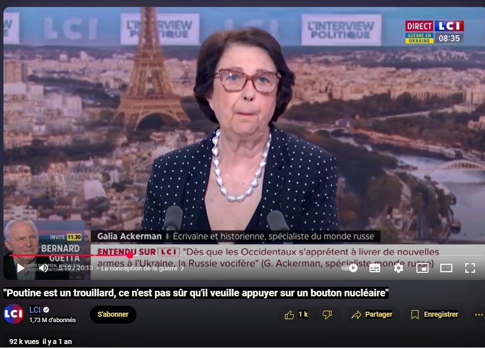 "Poutine est un trouillard. Dans les premiers mois de la guerre, on l'a même dénommé 'papy du bunker'. Ce n'est pas sûr qu'il veuille appuyer sur un bouton nucléaire" : Galia Ackerman, invitée d'Adrien Gindre dans Les Matins LCI.