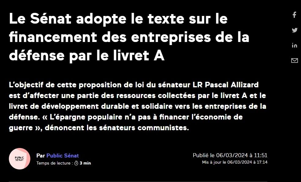 L’objectif de cette proposition de loi du sénateur LR Pascal Allizard est d’affecter une partie des ressources collectées par le livret A et le livret de développement durable et solidaire vers les entreprises de la défense. « L’épargne populaire n’a pas à financer l’économie de guerre », dénoncent les sénateurs communistes.