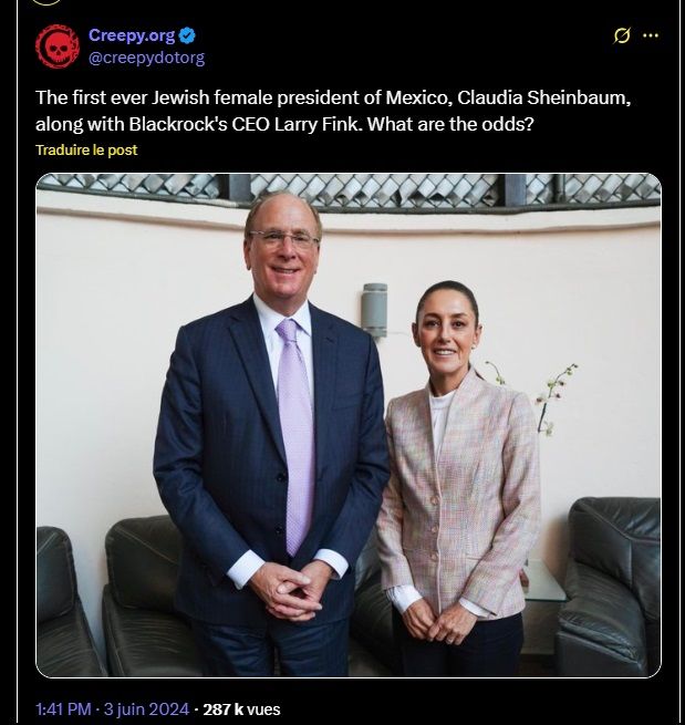 The first ever Jewish female president of Mexico, Claudia Sheinbaum, along with Blackrock's CEO Larry Fink. What are the odds?