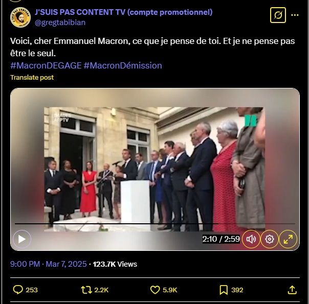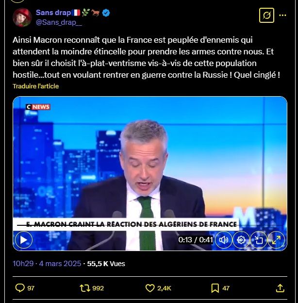 Ainsi Macron reconnaît que la France est peuplée d'ennemis qui attendent la moindre étincelle pour prendre les armes contre nous. Et bien sûr il choisit l'à-plat-ventrisme vis-à-vis de cette population hostile...tout en voulant rentrer en guerre contre la Russie ! Quel cinglé !