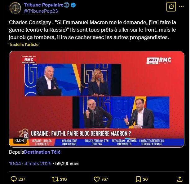 Charles Consigny : "Si Emmanuel Macron me le demande, j'irai faire la guerre (contre la Russie)" Ils sont tous prêts à aller sur le front, mais le jour où ça tombera, il ira se cacher avec les autres propagandistes.