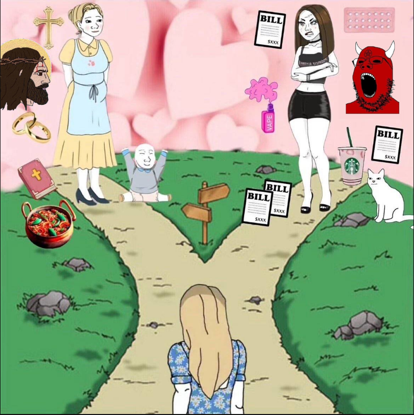 La pute blanche souhaite la fin des « comportements archaïques » de la femme au foyer qui s'occupe des enfants afin de pouvoir faire la pute en discothèque ; mais se met a chialer lorsque l'homme aussi, de son côté, applique son discours et met fin à ces "comportements archaïques" de l'homme protecteur. Elle refuse d'assumer son rôle biologique (=la génitrice) ; mais reproche au mâle d'en faire de même (=le protecteur)