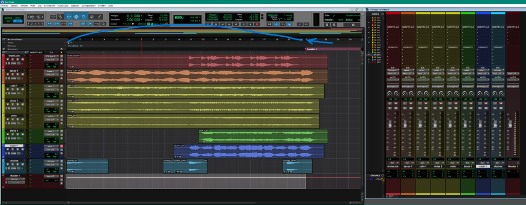 pour celle la j'ai d'abord fait les accords au piano et ensuite j'ai repris chaque éléments et j'ai fait une orchestration m en assignant la ligne de basse à la contrebasse et ainsi de suite, et j'ai essayé d'harmoniser le tout. oui c'est dans ma tete, je fais mélange piano et clics de souris, ensuite j'imagine les prochaines notes qui vont bien sonner et je fais au fur et a mesure.