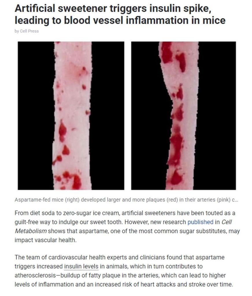 Les recherches publiées dans Cell Metabolism montrent que l'aspartame fait grimper le taux d'insuline, ce qui entraîne une inflammation des vaisseaux sanguins et une accumulation de plaques artérielles chez les souris.