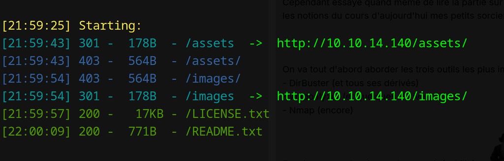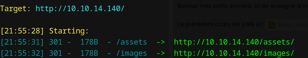 Il nous montre qu'il a trouvé le dossier images et assets. Si on utilise ça avec une autre wordlist beaucoup plus complète on peux trouver les info suivantes: