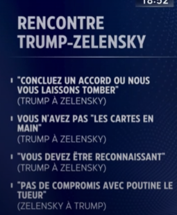 Donald Trump, qui a jugé qu'il sera "très difficile" de négocier avec Volodymyr Zelensky, lui a lancé en colère qu'il devait se montrer "reconnaissant", après avoir affirmé que le président ukrainien s'était mis "en très mauvaise posture" et n'avait pas "les cartes en main".