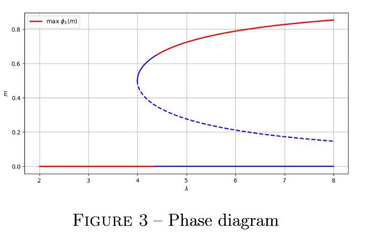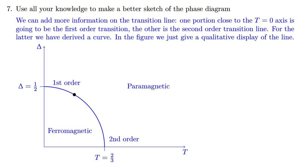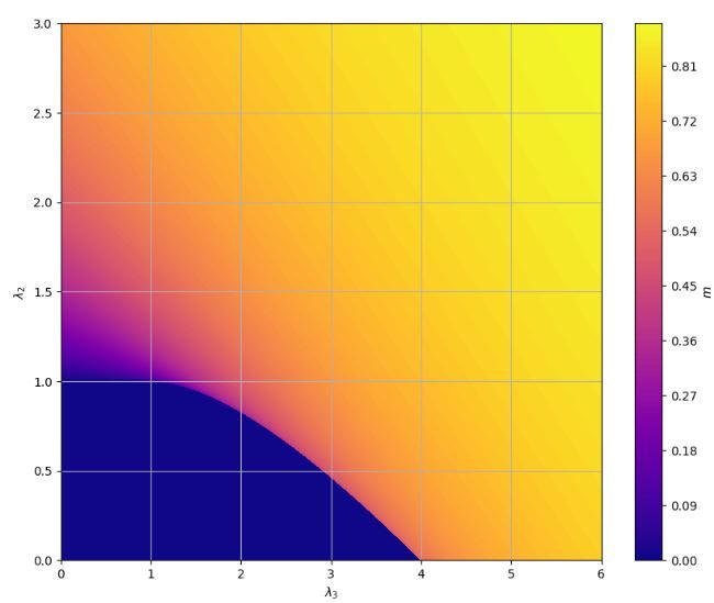 Et on peut observer à partir de quelle température (T), et quelle valeur de champ magnétique extérieur (Delta) le système de spin changera de phase (ferromagnétique ou paramagnétique: matériau aimanté ou non aimanté en gros). Il est possible de tracer notre fonction d’entropie, et de regarder quelles sont les valeurs qui la maximise, et comment ces valeurs des maximums évoluent lorsque l'on change la température et le champ magnétique externe (cela donne une intuition sur des transitions de phases du 1er ordre ou 2nd ordre)