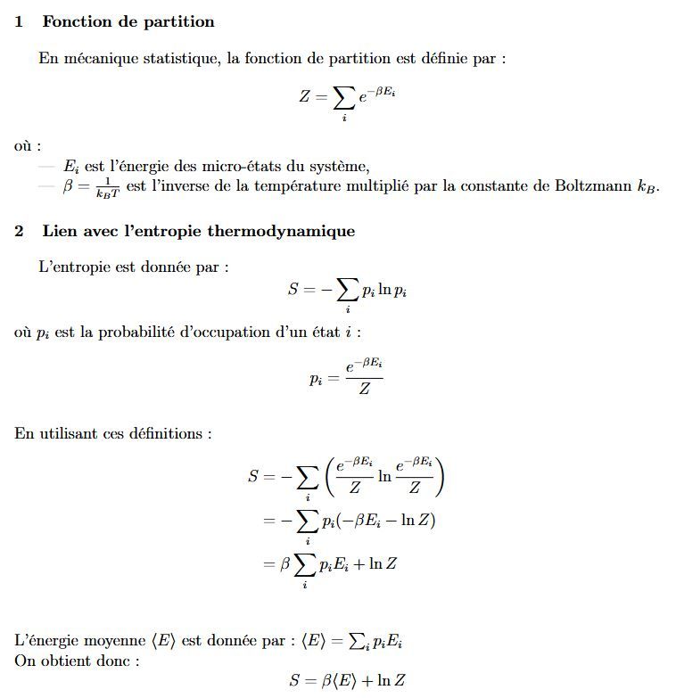 La fonction de partition Z est effectivement très utile, mais l’entropie ajoute une information cruciale : la répartition des états et la direction d’évolution du système (expliquant d’ailleurs pourquoi certains processus sont irréversibles). Grâce à l’entropie, que l'on peut retrouver à partir de Z donc, il est possible de :
