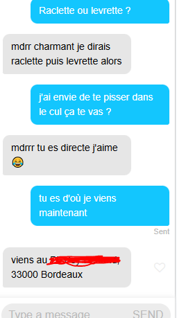 écrit lui '' j'ai envie de congeler ma merde et la foutre dans ton vagin en chantant le générique de marsupilami oubaaa oubaaa marsupiplamiiiii "