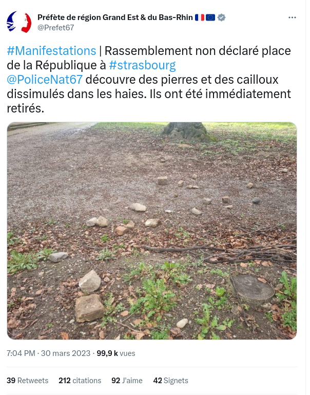"Nous avons trouvé dans les buissons de petites baies rouges surement dissimulées ici par des blacks blocks ultra violents d'ultra gauche ultra radicale dans le but de servir de projectiles contre nos forces de l'ordre, intervention du RAID terminée, manifestation annulée"