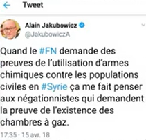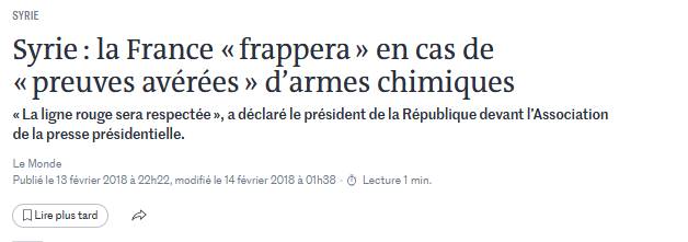 On est loin du temps où Canal + nous mettait en garde contre la propagande de guerre et des images. Et dire que les médias français ont crédibilisé quelques photos et vidéos que n'importe qui peut faire pour faire croire à absolument n'importe quoi sur n'importe quel sujet. Tout en accusant ceux qui mettaient en doute ce narratif bidon d'être extrémiste, pro russe, négationniste ou je ne sais quoi. Force est de constater que la thèse d'une fabrication vidéo est plus crédible que la thèse d'une attaque chimique orchestrée par le régime. Quand bien même aurait elle lieu que le manque d'imagination des services français n'est pas une preuve suffisante pour imputer la responsabilité de l'attaque à Bachar. Ce qui est sûr, c'est que ni Macron ni personne n'avait de preuves suffisantes pour bombarder un pays.