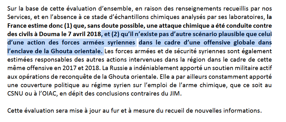 Sauf que ce document était moins affirmatif que Macron. Dès que ça parle de l'attaque chimique, de la nature des produits utilisés et de l'implication de l'armée syrienne, l'utilisation se fait avant tout au conditionnel. On nous parle de faisceau de preuves fournis par des ONG soit disant habituellement fiables, dont on peut conclure avec un haut niveau, pas de certitudes, que la majorité ( pas la totalité ) est de facture récente. Récente, on ne sait pas trop ce que ça veut dire ici, quelques jours, une semaine, un mois, on n'en savait rien. Et le rapport ne révèle pas de fabrication. Je cite " Nous estimons avec un haut niveau de confiance qu'elles sont le fait du régime syrien car il n'existe pas d'autre scénario plausible que celui d'une action des forces armées syriennes. " En gros la logique c'est que c'est lui parce que ça ne peut être personne d'autre, soit disant. Le tout sur la foi de vidéos postés sur les réseaux sociaux. On ne sait pas qui a fait ça ni quels produits ont été utilisés mais ce serait forcément Bachar le coupable. Drôle de manière de procéder n'est ce pas? L'avantage de ce genre d'explications, c'est qu'on peut l'utiliser pour raconter tout et n'importe quoi, pour prouver tout et n'importe quoi.