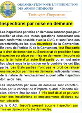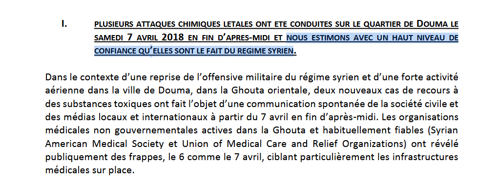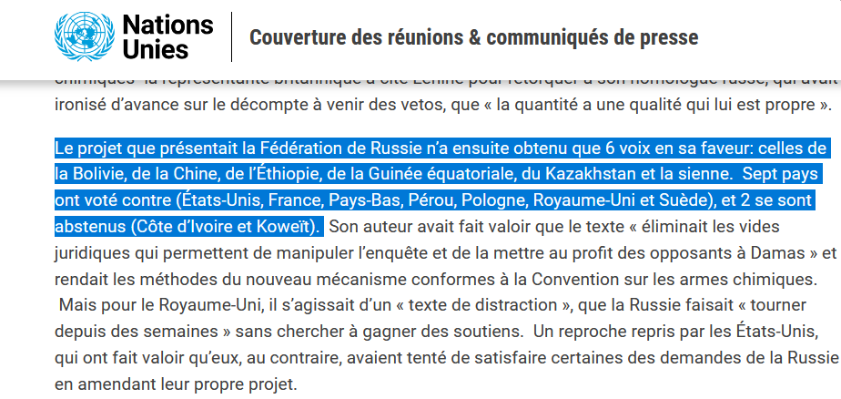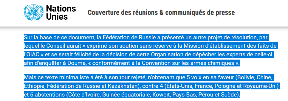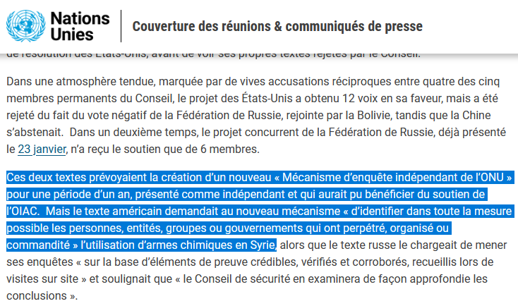 Il faut savoir que concernant l'attaque chimique du 7 avril, ce sont les syriens et les russes qui ont proposé une visite d'inspection d' l'OIAC, sur le lieu du drame pour qu'une enquête indépendante soit menée sur l'affaire. Concernant l'attaque chimique, le 10 avril, ce n'est pas un mais trois projets de résolution qui ont été rejetés à l'ONU de la Douma. Le but des Etats Unis était de créer un organisme indépendant. Et le tout pour trouver le coupable et non pas pour voir s'il y avait une attaque chimique ou pas. C'est ce mécanisme que les russes avaient rejeté en le qualifiant de marionnette entre les mains des forces Anti Damas.
