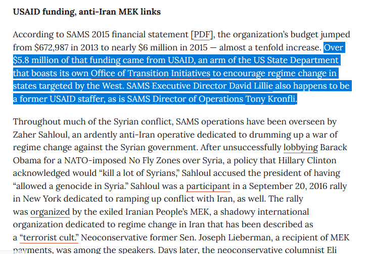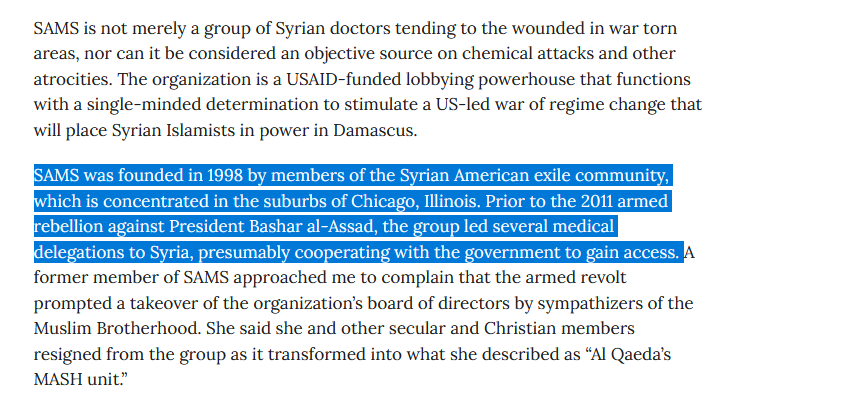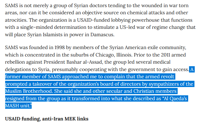 Dans la version des néocons de l'attaque chimique, quelque chose ne va pas. Du coup quelles sont les ONG citées dans le rapport comme étant habituellement fiables. 2 ONG sont citées notamment. La Syrian American Medical Society et L'Union of Medical Care and Relief Organizations. La première aussi appelée SAMS, est une ONG fondée par des exilés syrien en 1998 et basé aux Etats Unis, qui travaillent en collaboration avec le gouvernement syrien pour apporter de l'aide médicale dans le pays. Rien d'extravagant à première vue mais après cette organisation a changé. Après le déclenchement de la guerre civile en Syrie, cette association déjà présente sur le terrain a vu afflué l'argent car dans le rapport 2014 2015, la SAMS indique que son budget est passé de 100 000 à 15 millions de dollars en 4 ans et que leur staff est passé de 1 à 60 personnes et ce dans 5 pays différents. Puis 37 millions en 2016. En 2018, le budget est encore plus énorme. Ce n'est pas une coincidence car comme l'ONG était présente sur le terrain depuis longtemps sur le terrain. Chaque années, la SAMS touche plusieurs millions de dollars du département américain via l'USAID. 2 cadres d'ONG sont d'ailleurs d'anciens employés de l'USAID. Aussi en 2017, la France lui a versé 350 000 euros. Donc cela n'a pas grand chose avoir avec une organisation non gouvernementale. Au contraire même. Et depuis 2011 c'est devenu une courroie de transmission de la politique américaine en Syrie, et donc des néoconservateurs dans le cadre du printemps arabe visant à remplacer pour beaucoup modérés et laics mais s'opposant aux intérêts néocons dans cette région par les Frères musulmans, plus radicaux sur la religion, les droits de l'homme, etc... Et également plus en accord avec les intérêts de la politique impérialiste américaine, un peu comme le fut l'Arabie Saoudite pendant un certain temps.