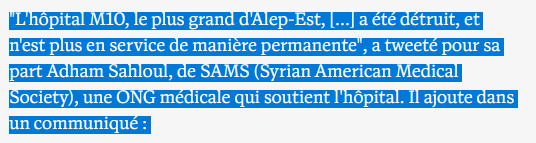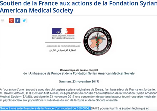 Que ce soit France 24, Europe 1, BFM, le Parisien, le Figaro, Libération, le Hufftington Post, le Point, le Monde, l'Express, le Monde, quasiment tous les grands médias oligarchiques français ont repris les dires de la SAMS. Les fameuses ONG financés par les gouvernements et les néocons.