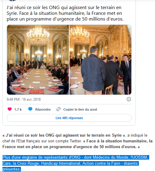 Ensuite, il y a la Syrian American Foundation. Visiblement, ils enverraient des containers de matériels médicales et de vêtements en Syrie, le tout financés avec des repas de charité. Leur site nous dit que leur matériel a été envoyé en Syrie par d'autres ONG. Donc la présence de la Syrian American Foundation en Syrie se limite à aucune personne. Et cet association fait partie malgré tout de l'UOSSM. Ce même UOSSM qui publiait des communiqués pour nous dire quand et où ont eu lieu ces attaques chimiques. Les médias nous ont présenté cette merde globale comme un ensemble de collectifs d'ONG présents sur place et neutres et fiables. En plus de cela, l'organigramme de ces boutiques n'est même pas public. Macron avait annoncé un plan humanitaire de 50 millions d'euros distribués à des ONG dont l'UOSSM pour financer des projets dans le Nord Ouest, le Ghouta et le Nord Est.